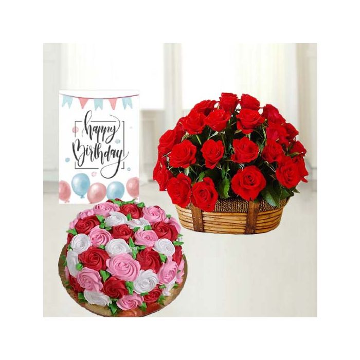20 red roses basket, floral theme cake in vanilla flavour, birthday greeting card