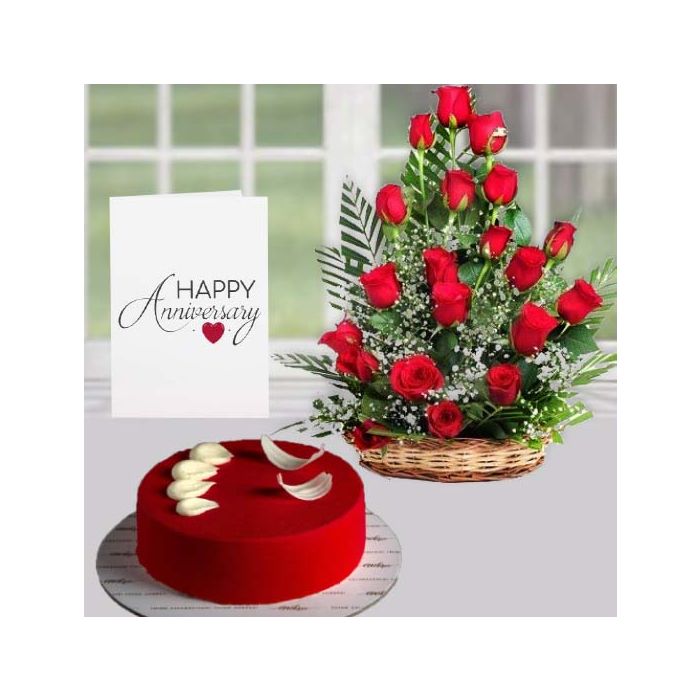 20 red roses basket arrangement, red velvet cool cake, anniversary greeting card