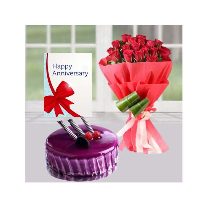 Celebrate your anniversary in style with this amazing gift bundle! It includes a gorgeous bouquet of 20 red roses, a delicious black currant cool cake, and a beautiful greeting card. All of these items are expertly chosen to make your anniversary extra special. The roses are fresh and vibrant, the cake is rich and decadent, and the greeting card is sure to express your love and appreciation. Order this bundle now and make your anniversary truly unforgettable!