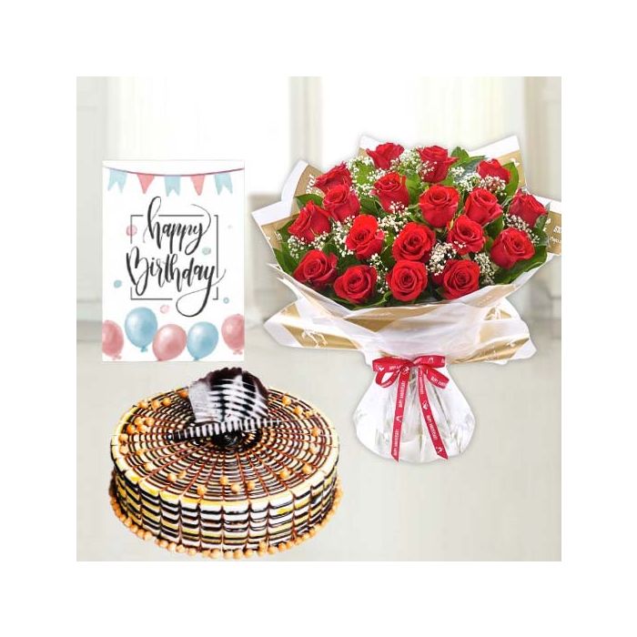 20 red roses bunch, premium quality butterscotch cool cake, birthday greeting card