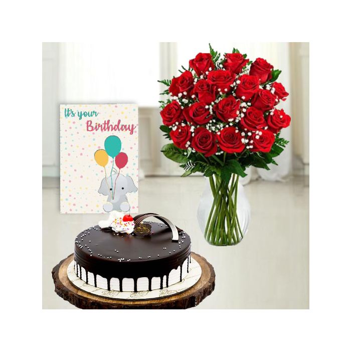 20 red roses in glass vase, chocolate vanilla cool cake, birthday greeting card