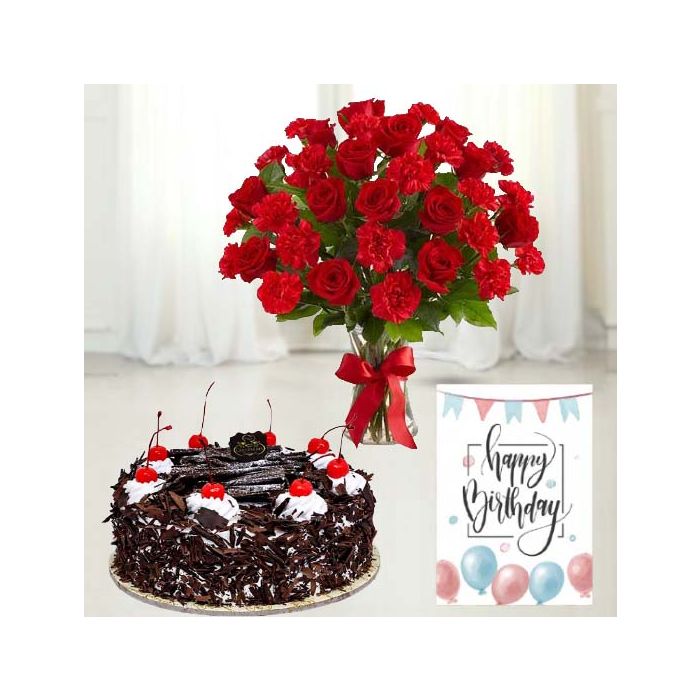 20 red roses with red carnations, black forest fresh cream cake, Birthday card