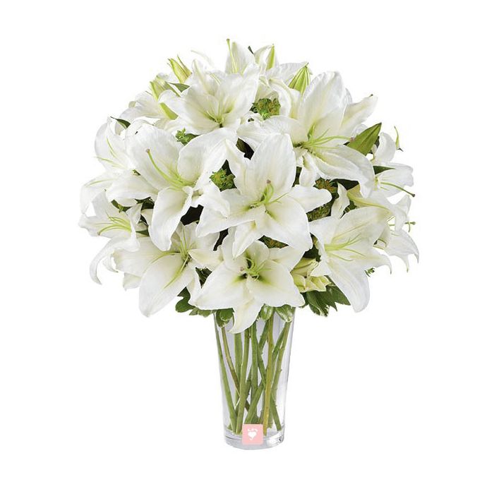 Looking for a romantic gesture that is sure to impress? Look no further than our stunning arrangement of 20 white lilies in a glass vase. This luxurious bouquet is the perfect way to show your special someone how much you care. The pure white lilies are elegantly arranged in a glass vase, making it a chic and sophisticated gift that is sure to make a lasting impression.