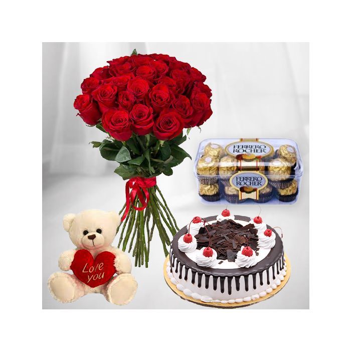 24 red Roses bunch with 1 pound black forest cake ,6 inch teddy,16 pcs ferrero Rocher chocolates