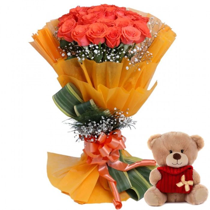 Looking for the perfect way to say "I love you?" Look no further than this beautiful bundle of 30 orange roses with an 8 inch teddy bear. The perfect way to show your significant other how much you care, this heartfelt gift is sure to fill them with happiness and love.