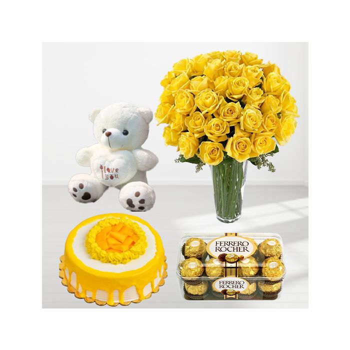 This beautiful bouquet of 30 yellow roses is the perfect way to show your special someone how much you care. The vibrant flowers are arranged in a glass vase and paired with a delicious mango cake with 16 pcs rocher ferrero cake. The arrangement is completed with a cute 1 feet height teddybear, making it a truly thoughtful and memorable gift.