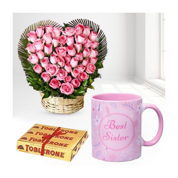 40 pink roses heart shape arrangement , photo mug with set of 3 toblerone chocolates