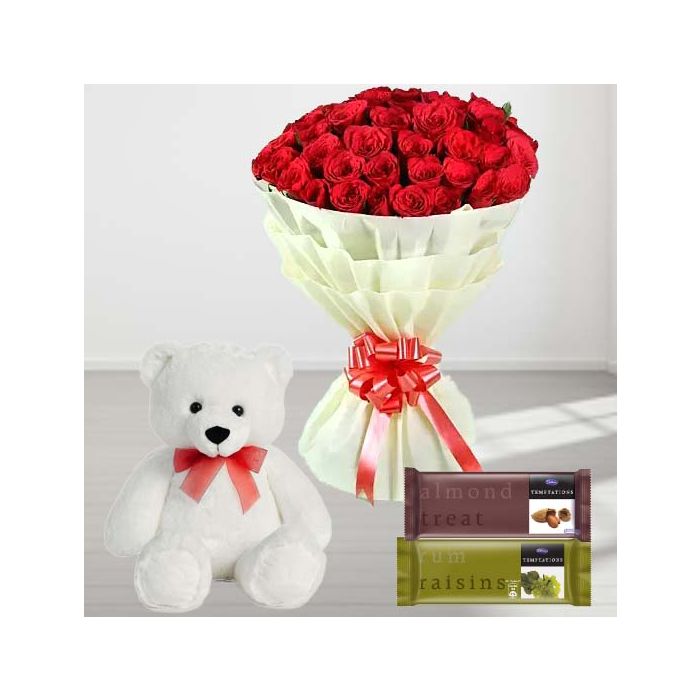 40 red roses hand bouquet with 6 inch teddybear with set of 2 temptations chocolates