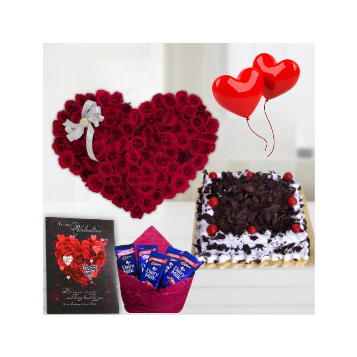 40 red roses heart shape arrangement , Half kg square shape black forest cake, 2 heart shape balloons , Greeting card with pack of 5 diary milk chocolates