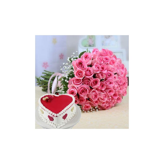 Product Description 1 | 50 pink Roses arrangement with 1 pound fresh cream cake |