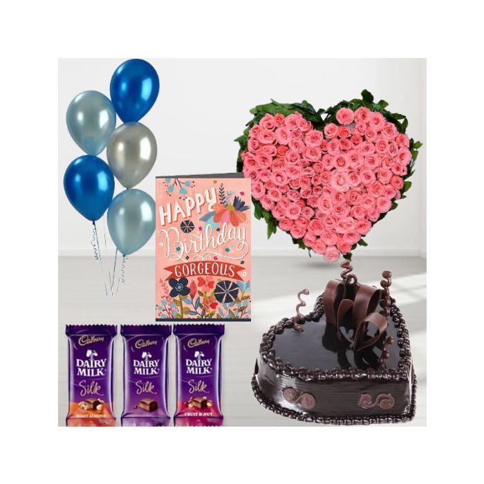 Welcome to our special day! Today, we are excited to offer you a truly unique and romantic gift. Our 50 pink roses heart shape arrangement, heart chocolate cake, set of 3 dairy milk silk chocolates, birthday greeting card, and 5 blown balloons is the perfect way to show your loved one how much you care.This astonishingly beautiful arrangement of 50 pink roses in a heart shape is accompanied by a delicious heart-shaped chocolate cake and a set of 3 dairy milk silk chocolates. It also comes with a birthday greeting card and 5 blown balloons, making it a complete gift for that special someone.This is an incredible gift that will fill your loved one's heart with happiness, love, and appreciation.