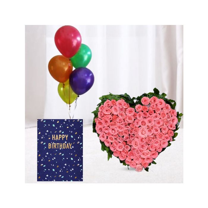 50 pink roses heart shape arrangement ,5 bunch of mix color balloon with birthday card