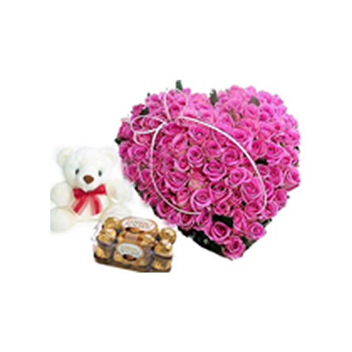 50 Pink Roses heart Shape Arrangement with 6 inch teddy,16 pcs Ferrero Rocher
