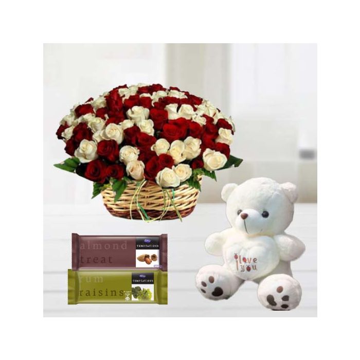 50 red and white roses basket arrangement with 6 inch teddybear with set of 2 temptations chocolates