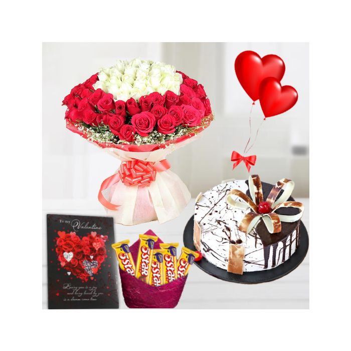 50 red and white roses exotic Bouquet, Half kg choco vanilla cake, pack of Five 5star chocolates , 2 heart shape balloons with Greeting card
