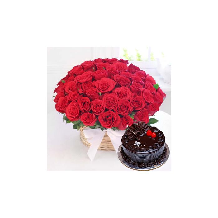 Product Description 1 | 50 Red Rose Basket With 1 Pound Chocolate Fantasy Cake |