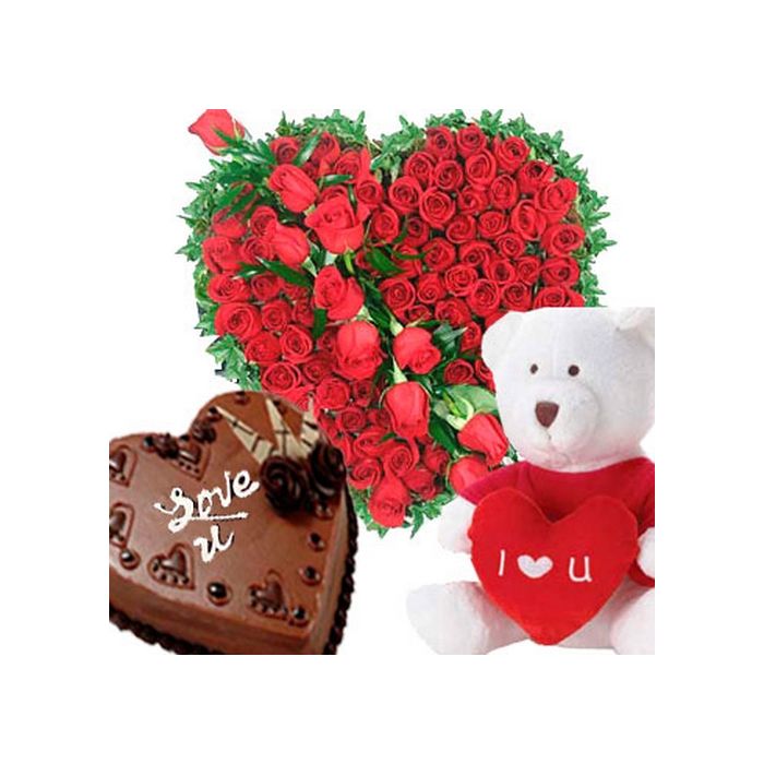 Product Description 1 | 50 Red Rose heart shape Arrangement with 1 pound heart shape chocolate cake with 8 inch teddy |