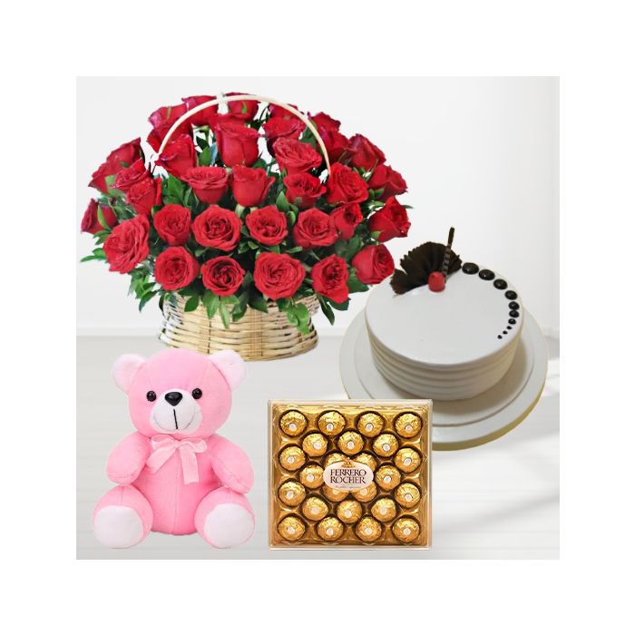 50 red roses basket arrangement , 1 feet height pink teddybear , premium quality vanilla cake , 24 pcs rocher ferrero chocolates