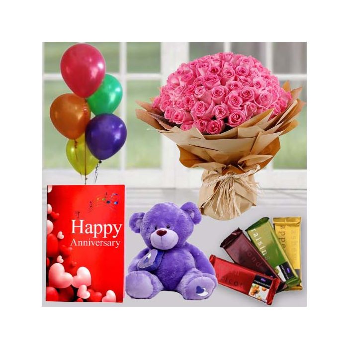50 red roses bunch , 6 inch teddybear , set of 4 temptations chocolates, anniversary greeting card with 5 blown balloons