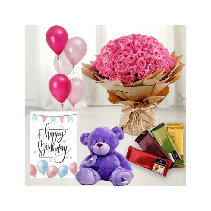 50 red roses bunch , 6 inch teddybear , set of 4 temptations chocolates,birthday greeting card with 5 blown balloons