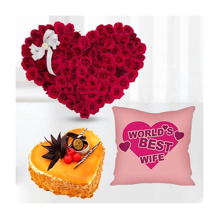 This Valentine's Day, let your loved one know just how much you care with this stunning heart-shaped arrangement of 50 red roses. Nestled amongst the lush greenery are 1 kg heart shape mango cake with photo cushion, making this a truly unique and special gift. The natural beauty of the roses is offset by the sweetness of the cake, creating a perfect balance of romance and indulgence. So show your significant other just how much they mean to you this Valentine's day with this unforgettable gift.