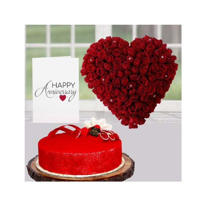 50 red roses heart shape arrangement, red velvet cake, anniversary greeting card
