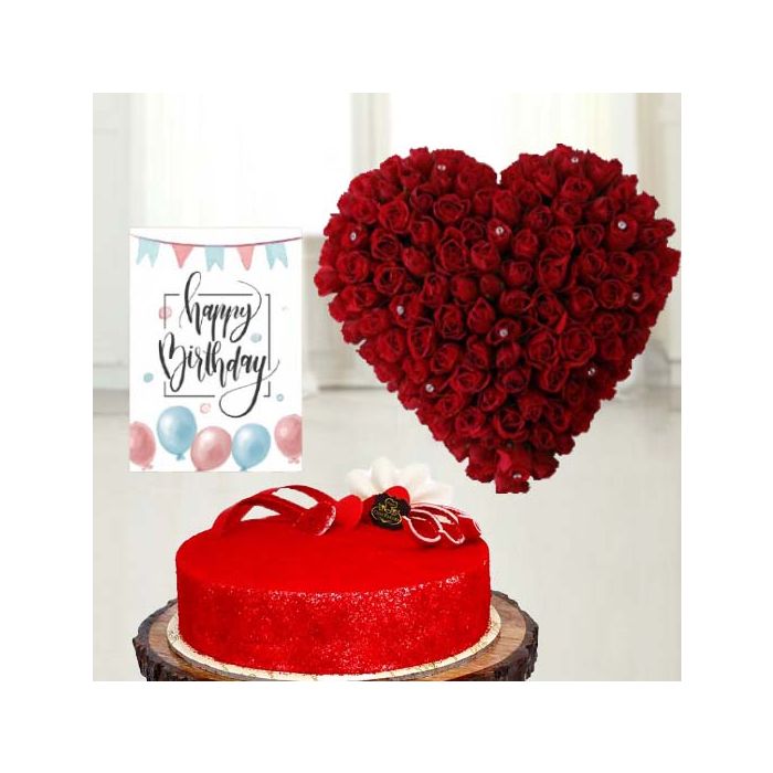 50 red roses heart shape arrangement, red velvet cake, birthday greeting card