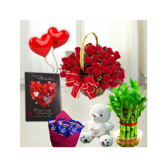 6 inch teddybear arranged in heart shape arrangement of 15 red roses, set of 3 bournville chocolates, 6 inch height teddybear , 2 layer Lucky bamboo plant ,5 blown balloons with greeting card