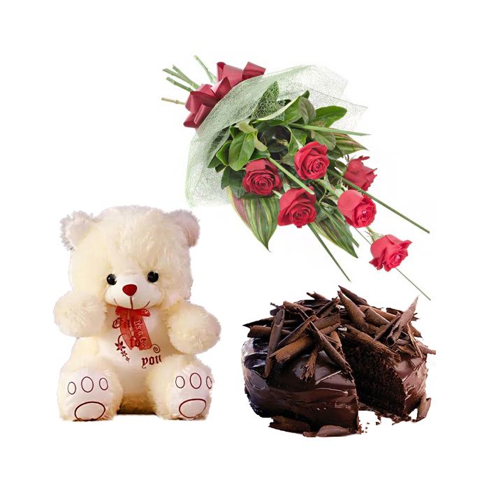 Looking for the perfect way to show your significant other how much you care? Look no further than our 6 roses with 8 inch teddy & 1 pound chocolate fant! This thoughtful and romantic gift is sure to let that special someone know just how much you love them.The 6 beautiful roses are expertly arranged in a glass vase, and come complete with a soft and cuddly 8 inch teddy bear. The perfect way to say "I Love You", this gift also includes a delicious 1 pound box of chocolates, making it even more special.Sure to put a smile on your loved one's face, our 6 roses with 8 inch teddy & 1 pound chocolate fant is the perfect way to show