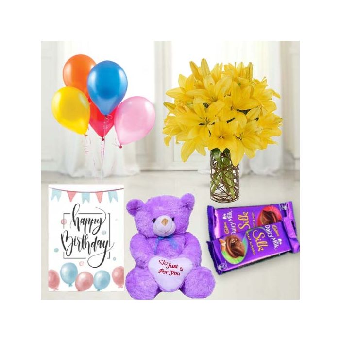 8 Yellow lilies in glass vase, 1 feet height teddybear, set of 2 dairy milk silk, birthday Greeting card with 5 blown balloons