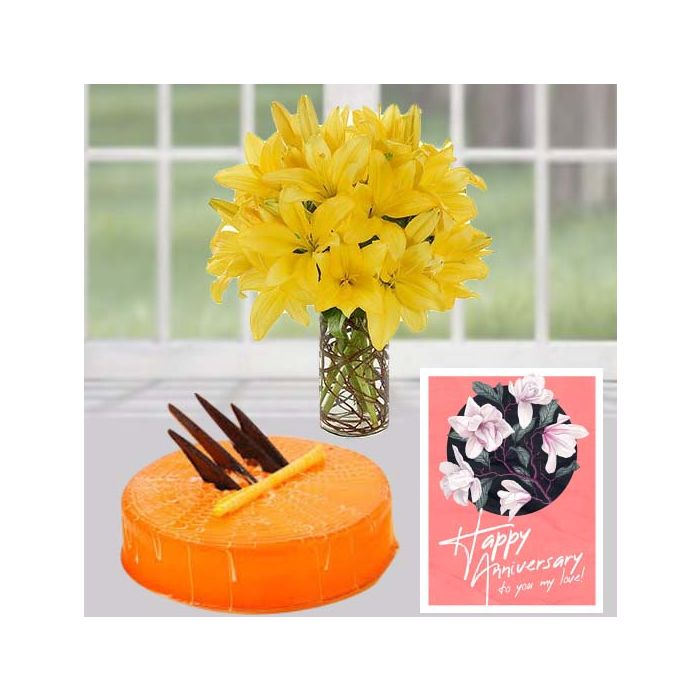 Anniversary flowers and cake What could be more special than receiving a beautiful bouquet of yellow lilies on your anniversary? This arrangement comes in a stylish glass vase and is accented with orange cool cake and an anniversary greeting card. It's the perfect way to show your loved one how much you care.