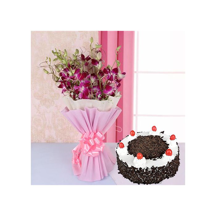 Introducing our newest and most delicious way to show your loved ones how much you care - the Bunch of 6 purple orchids with 1 kg blackforest cake! This decadent and stunning gift is perfect for any special occasion, like an anniversary, birthday, or just because.The Bunch of 6 purple orchids with 1 kg blackforest cake is a thing of beauty - six gorgeous purple orchids arranged in a bouquet, with a delicious 1 kg blackforest cake as the centerpiece. It's sure to make a big impression and put a smile on your loved one's face.But it's not just about looks - this cake is also incredibly delicious. Made with rich chocolate sponge, fresh cream