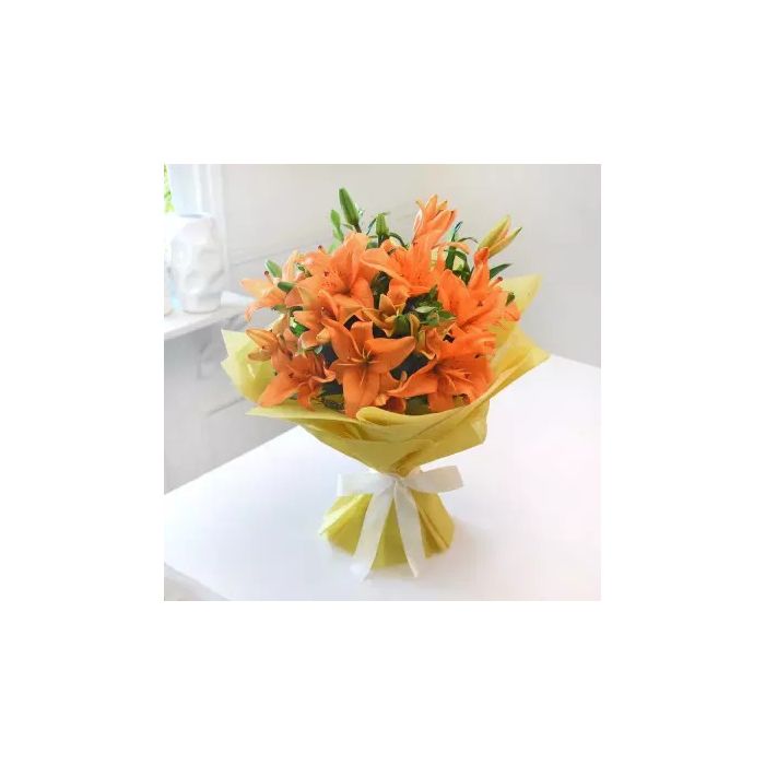 Introducing our arrangement of 5 orange lilies! This vibrant and beautiful arrangement is perfect for adding a touch of elegance to any room. The orange lilies are expertly arranged by our florists and are guaranteed to bring a smile to your face.Our arrangement of 5 orange lilies is the perfect way to show your loved ones how much you care. Whether you’re celebrating a special occasion or simply showing your appreciation, this arrangement is sure to impress. Order now and we’ll hand-deliver it fresh from our shop straight to your door.