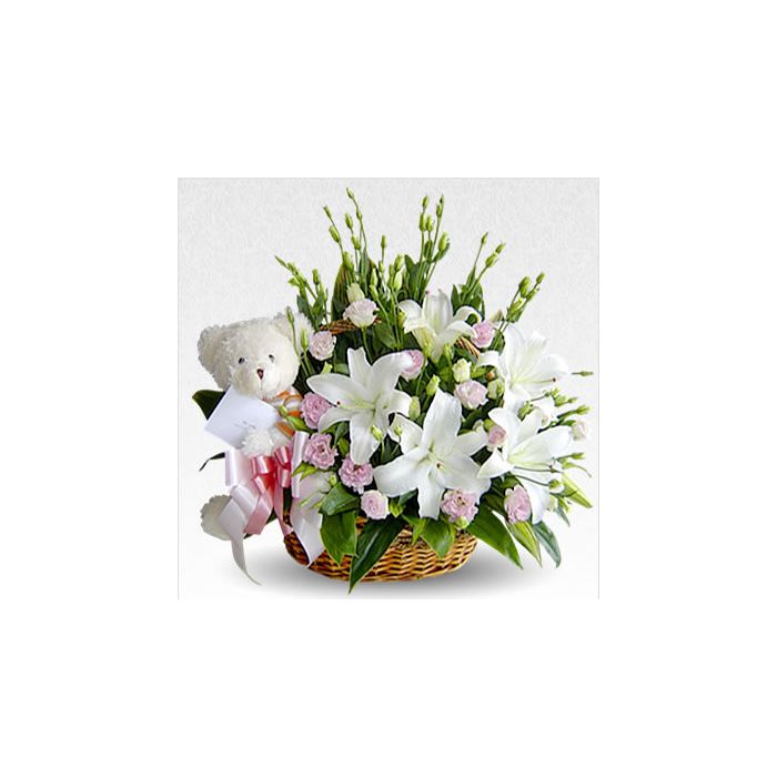 If you're looking for a creative, engaging, and persuasive way to show your loved ones how much you care, look no further than this arrangement of lilies with a teddy sitting in it! This beautiful arrangement is sure to put a smile on their face and let them know just how much you care.
