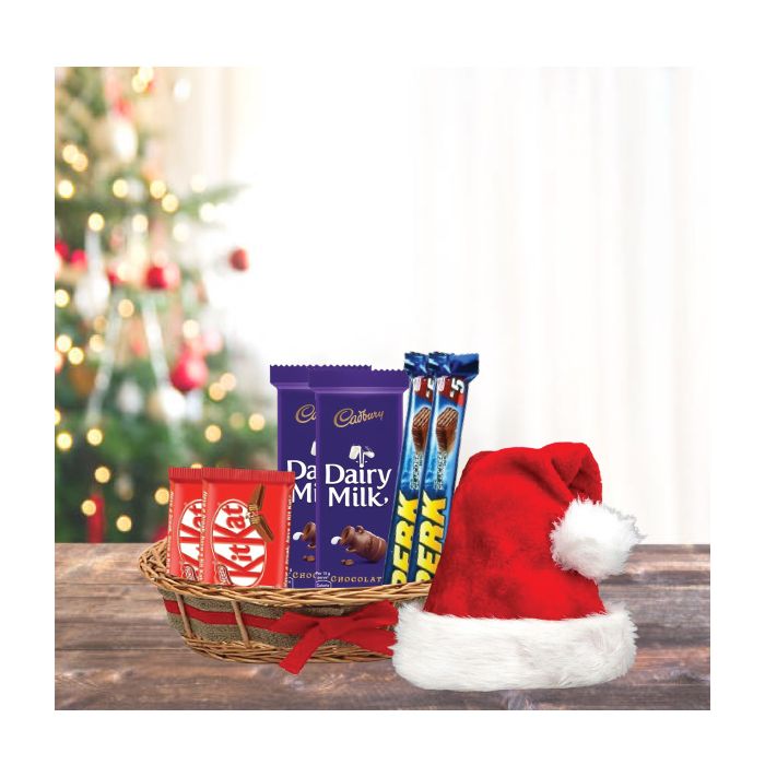 Assorted Chocolate Basket With 2 Kit Kat , 2 Dairy Milk Silk , 2 Perks and Santa Cap