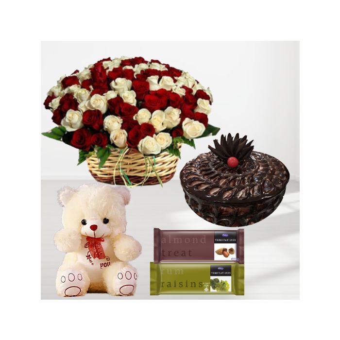 basket arrangement of 100 red and white roses, 1 feet height teddybear, chocolate fudge cake with pair of temptations chocolates