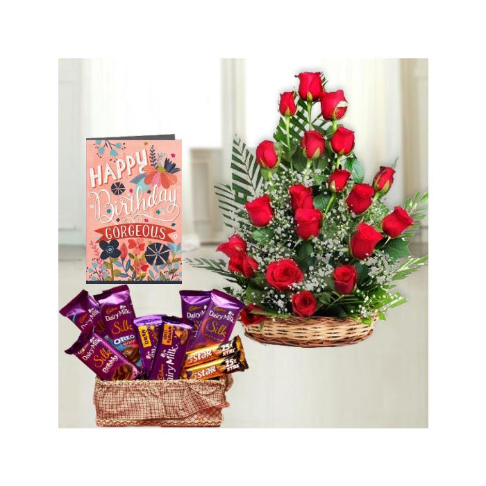 Basket arrangement of 20 red roses , Basket of 7 dairymilk silk 2 Fivestar chocolates, birthday greeting card