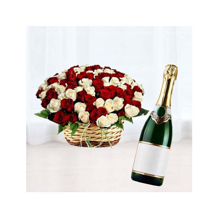 Basket arrangement of 50 red and white roses with bottle of champegne