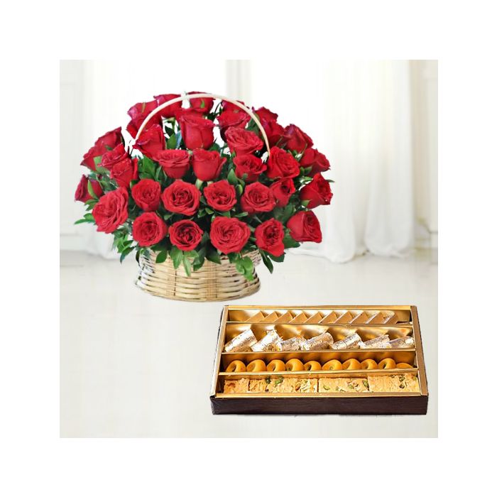 Product Description 5 | Basket arrangement of 50 red roses with 1 kg assorted sweets |