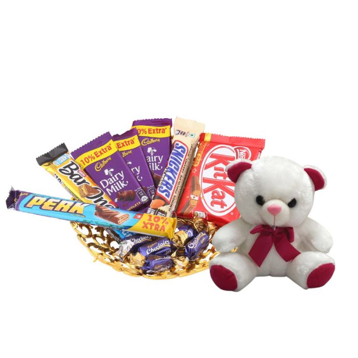 Welcome to the world of sweetness and love! This basket arrangement of a cute teddy bear with assorted chocolates is the perfect gift for your loved ones. The teddy bear is made of soft and cuddly material, making it a great companion for your loved ones. The chocolates are made with the finest ingredients and come in a variety of flavors that will tantalize their taste buds. This basket arrangement is the perfect way to show your loved ones how much you care.