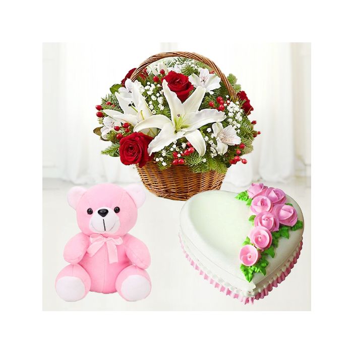 Product Description 5 | Basket arrangement of exotic lilies with fresh roses with heart shape vanilla fresh cream cake with 2 feet height teddybear |