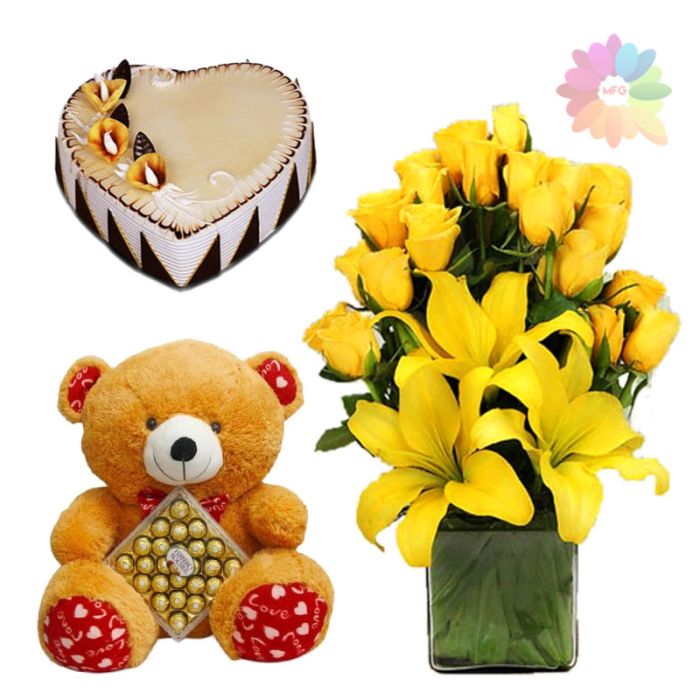 basket arrangement of lilies and roses with heart shape butterscotch cake with 2 feet height teddy bear carrying box of 24 pcs rocher ferrero chocolates
