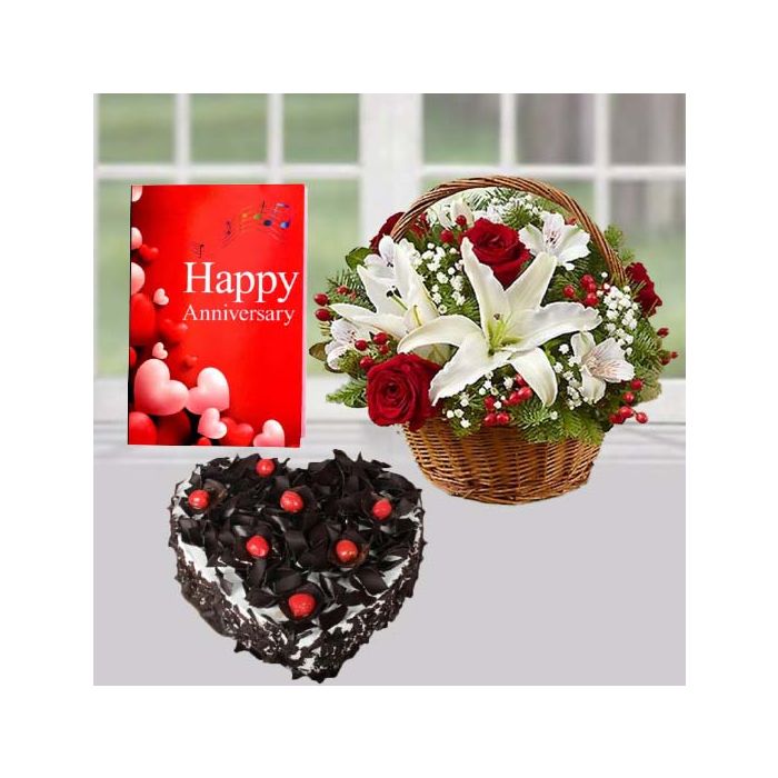Basket arrangement of red and white lilies , heart shape black forest cake, anniversary greeting card