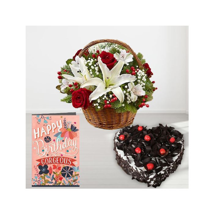 Looking for a romantic gift that will really make an impression? This basket arrangement of red and white lilies is perfect for expressing your love on a special occasion. The beautiful blooms are arranged in a heart shape, with a black forest cake nestled in the center. The cake is delicious and sure to satisfy any sweet tooth. There's also a birthday greeting card included, so you can say Happy Birthday in the most special way possible.