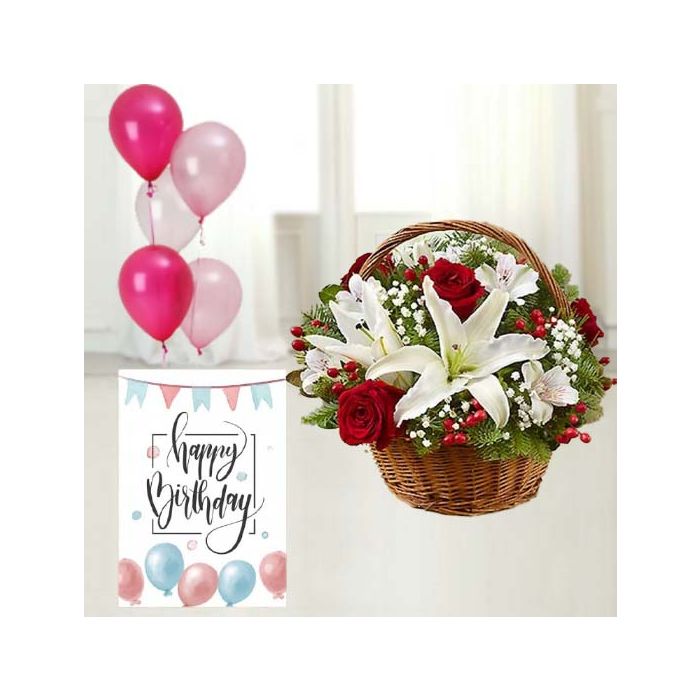 Basket arrangement of red roses with white lilies, 5 bunch of mix color balloons with birthday card