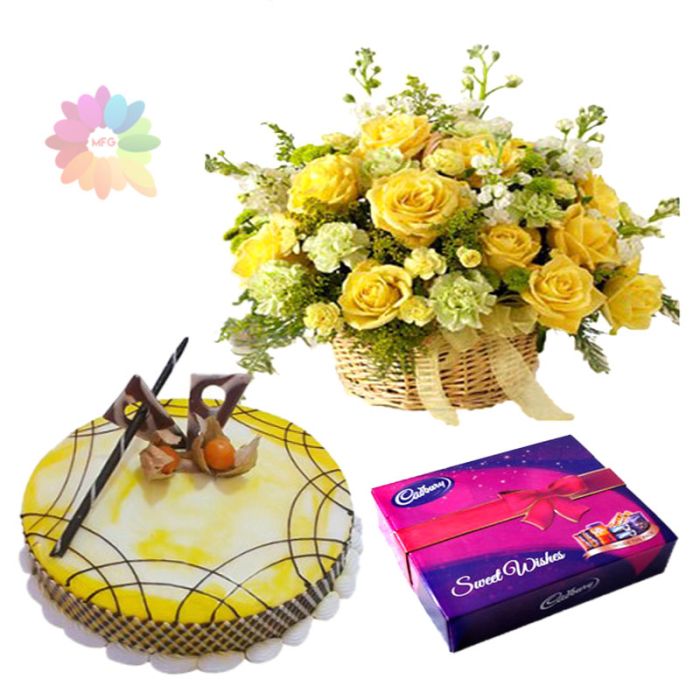 Basket of 12 yellow roses with pineapple cake with box of cadburys celebration