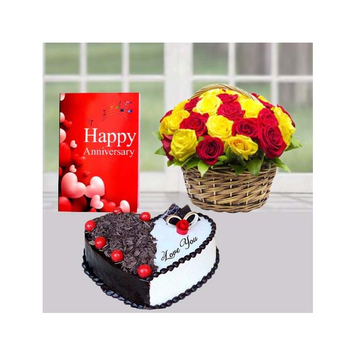 Anniversaries are a time to celebrate love, and what better way to do that than with a stunning basket of red and yellow roses? This beautiful arrangement comes with a delicious black forest heart shape cake, making it the perfect gift for your special someone. anniversary greeting card makes it complete.