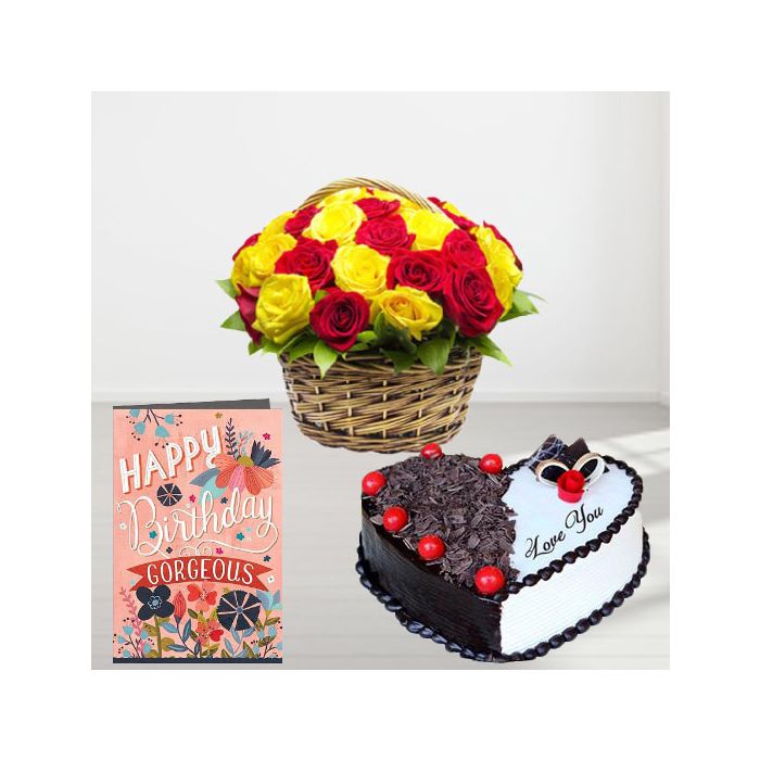 Basket of 15 red and yellow roses, black forest heart shape cake, birthday greeting card