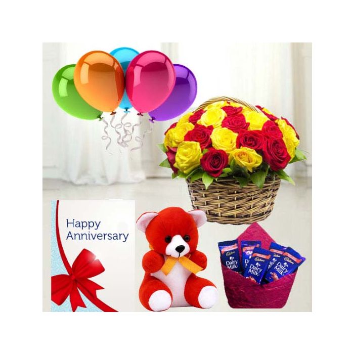 Basket of 15 red and yellow roses , 6 inch teddybear, set of 5 dairy milk chocolates, anniversary greeting card with 5 blown balloons