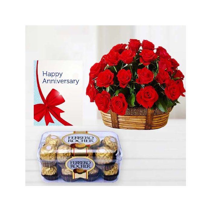 Basket of 15 red roses, 16 pcs rocher ferrero chocolates, anniversary greeting card